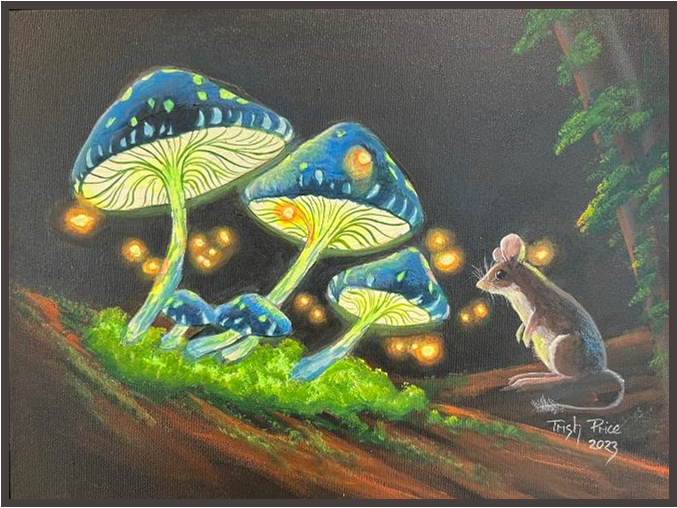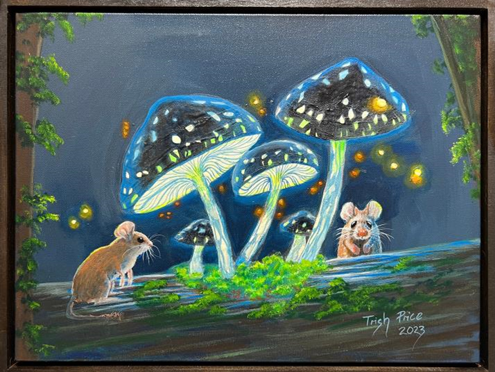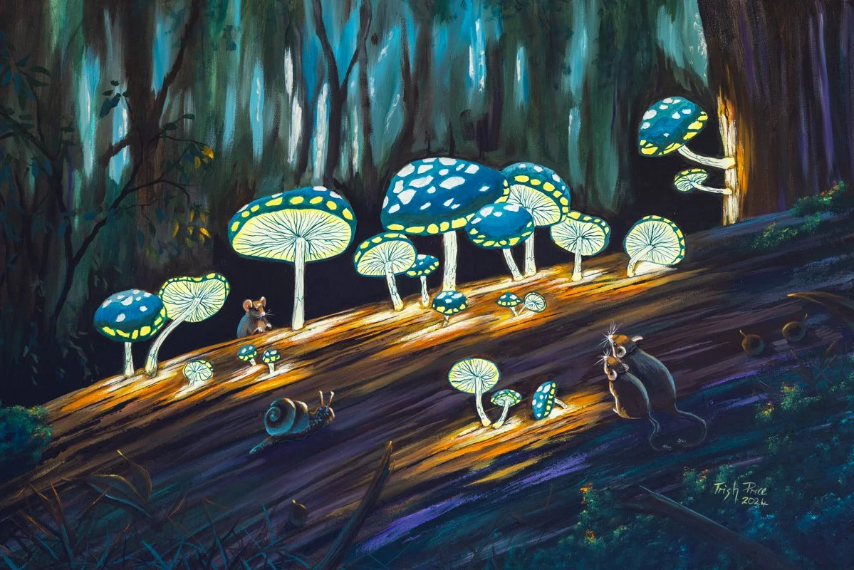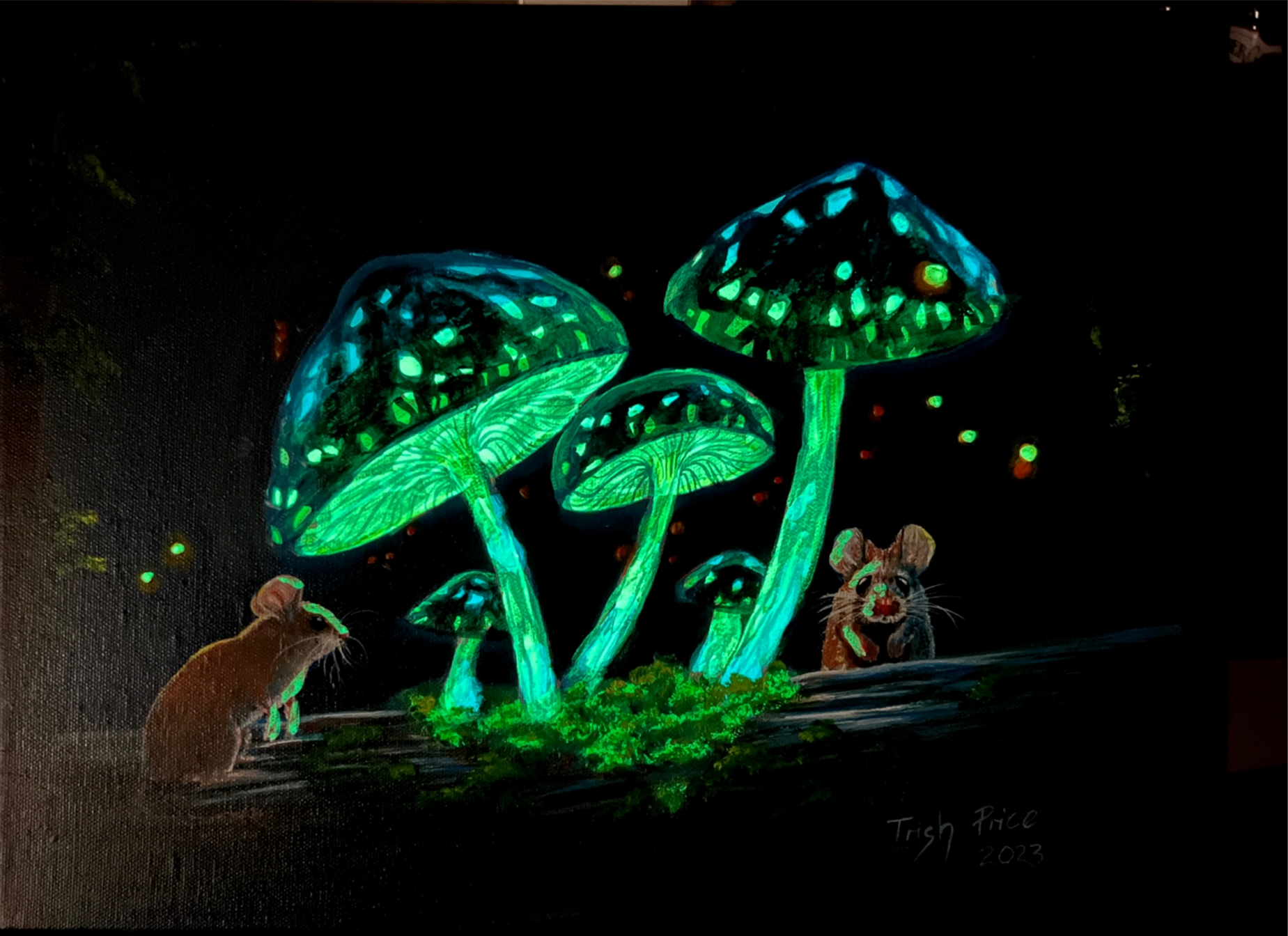 Bioluminescent fungi glow in the forest after dark. Native mice enjoy the soft light.