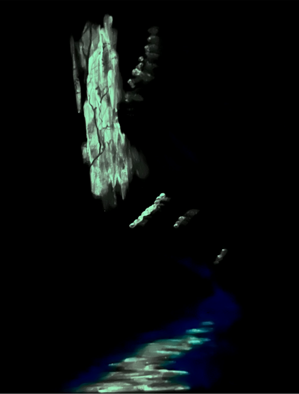 Look out towards the cave opening glowing in the moonlight. The river reflects this moonlit glow.